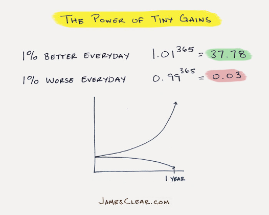 The aggregation of marginal gains shows how many small improvements, even just 1% at a time, compound into meaningful change over time. Improving by 1% each day doesn’t add up, it multiplies, leading to roughly 37× improvement over a year.
